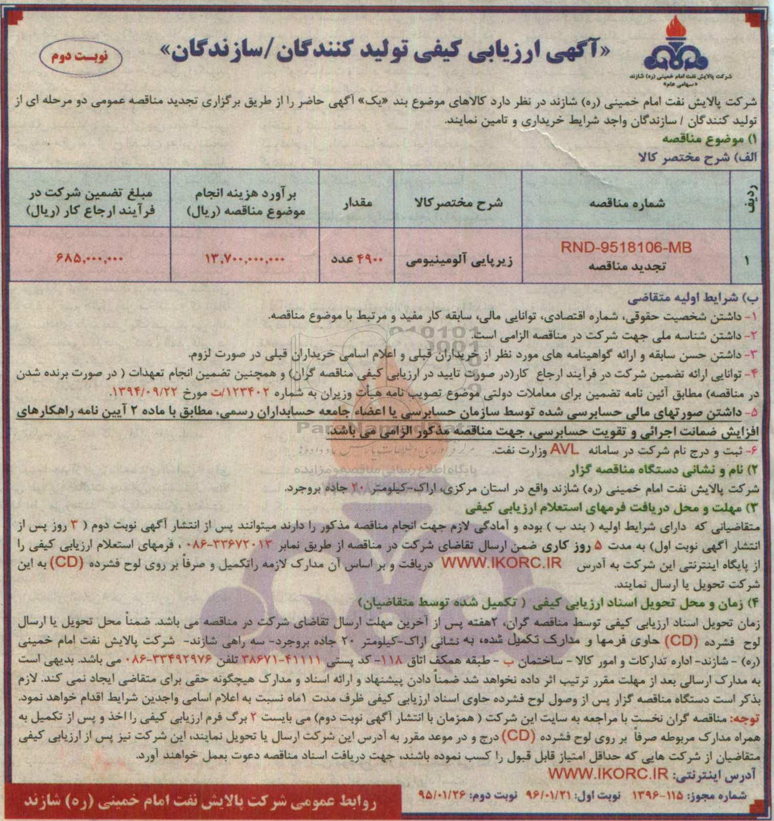تجدید ارزیابی کیفی زیرپایی آلومینیومی نوبت دوم از کلیه افراد متخصص و شرکتها واجد شرایط دعوت به عمل میآید در مناقصه با کد خبرگزاری پارس نماد: 829304 شرکت نمایند.