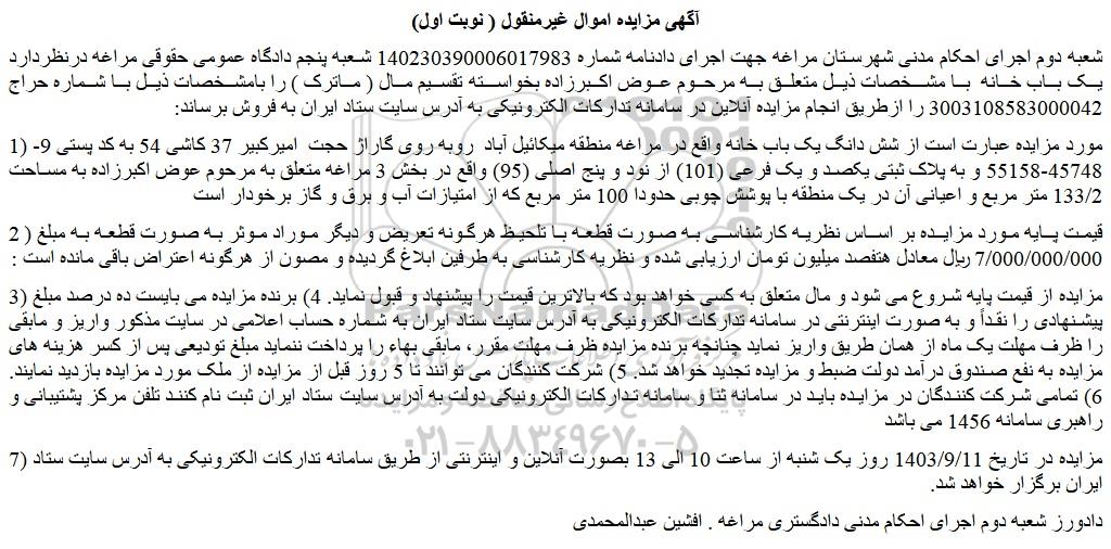 شعبه دوم اجرای احکام مدنی شهرستان مراغه جهت اجرای دادنامه شماره 140230390006017983 شعبه پنجم دادگاه عمومی حقوقی مراغه درنظردارد یک باب خانه با مشخصات ذیل متعلق به مرحوم عوض اکبرزاده بخواسته تقسیم مال ( ماترک ) را بامشخصات ذیل با شماره حراج 3003108583000042 را ازطریق انجام مزایده آنلاین در سامانه تدارکات الکترونیکی به آدرس سایت ستاد ایران به فروش برساند: