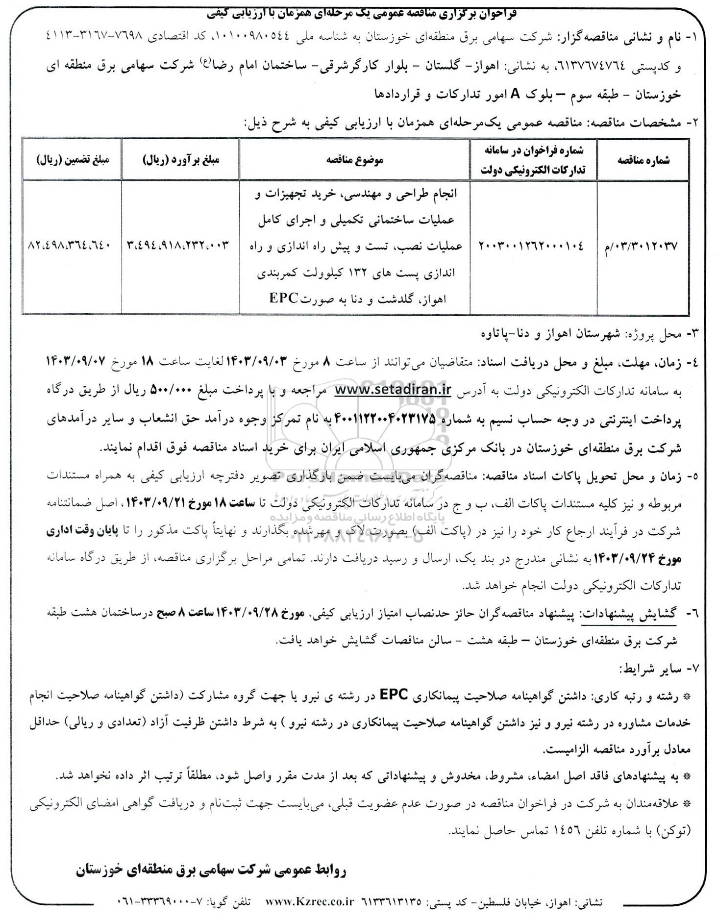 03/3012037/ م  2003001262000104 انجام طراحی و مهندسی، خرید تجهیزات و عملیات ساختمانی تکمیلی و اجرای کامل عملیات نصب، تست و پیش راه اندازی و راه اندازی پست های 132 کیلوولت کمربندی اهواز، گلدشت و دنا به صورت EPC 3.494.918.232.003 82.498.364.640
