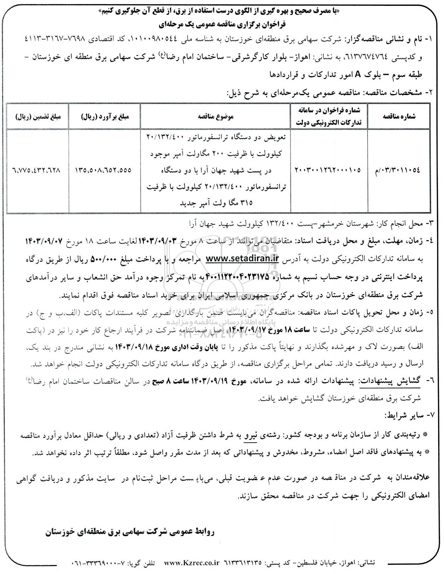 2003001262000105 | تعویض دو دستگاه ترانسفورماتور 20.132.400 کیلوولت با ظرفقیت 200 مگاولت امپر موجود در پست شهید جهان آرا با دو دستگاه ترانسفورماتور 20.132.400 کیلوولت با ظرفیت 315 مگا ولت امپر جدید | 135.508.652.555 | 6.775.432.628 |