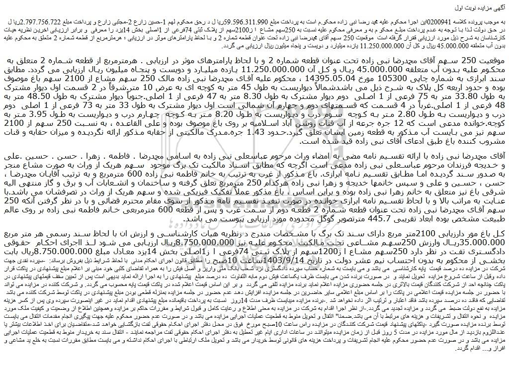 به موجب پرونده کلاسه 0200941این اجرا محکوم علیه محمد رضا نبی زاده محکو.م است به پرداخت مبلغ 59.596.311.990ریا ل د رحق محکوم لهم 1-حسین زارع 2-مجتبی زارع و پرداخت مبلغ 2.797.756.722ریا ل در حق دولت لذا با توجه به عدم پرداخت مبلغ محکو م به و معرفی محکوم علیه نسبت به 250سهم مشاع ا ز2100سهم از پلاک ثبتی 74فرعی از 1اصلی بخش 14یزد را معرفی و برابر ارزیابی اخرین نظریه هیات کارشناسان به شرح ذیل مورد ارزیابی ققرار گرفته است موقعیت 250 سهم آقای محمدرضا نبی زاده تحت عنوان قطعه شماره 2 و با لحاظ پارامترهای موثر در ارزیابی ؛ هرمترمربع از قطعه شماره 2 متعلق به محکوم علیه بدون آب متعلقه 45.000.000 ریال و کل آن 11.250.000.000 یازده میلیارد و دویست و پنجاه میلیون ریال ارزیابی می گردد.
