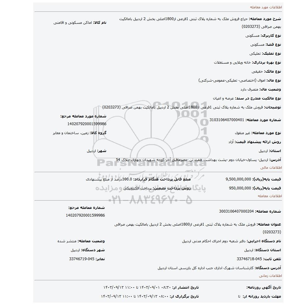 عنوان معامله: فروش ملک به شماره پلاک ثبتی 1فرعی از1800اصلی بخش 2 اردبیل بامالکیت بهمن صرافی (0203273) | ||