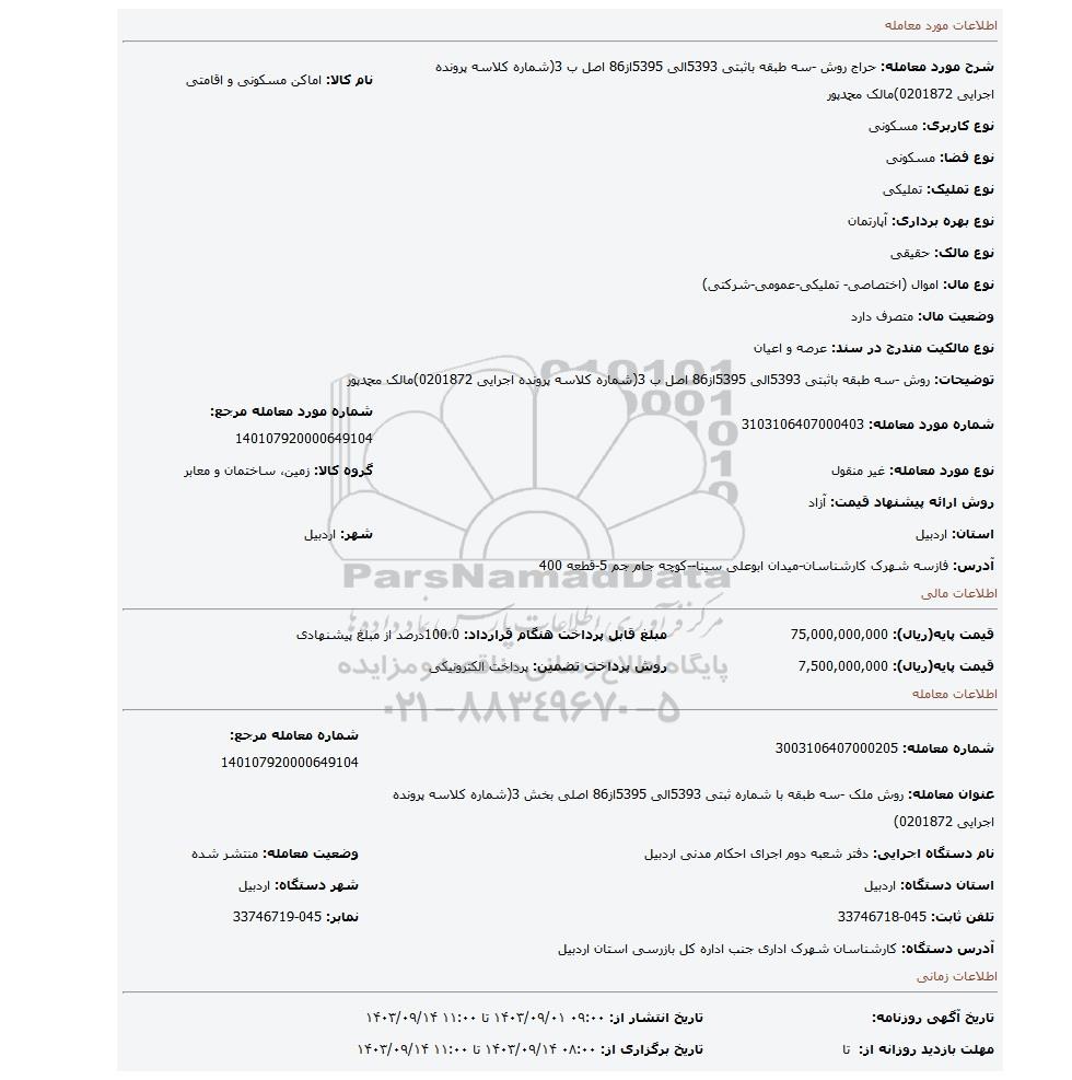شرح مورد معامله: حراج روش -سه طبقه باثبتی 5393الی 5395از86 اصل ب 3(شماره کلاسه پرونده اجرایی 0201872)مالک محمدپور | نام کالا: اماکن مسکونی و اقامتی | |