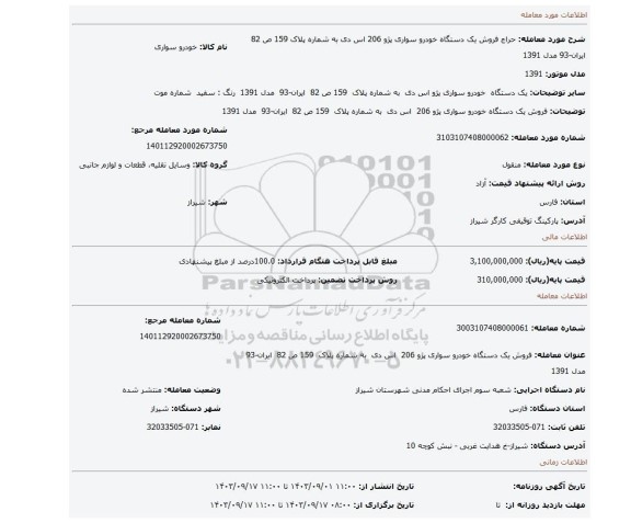 | عنوان معامله: فروش یک دستگاه خودرو سواری پژو 206 اس دی به شماره پلاک 159 ص 82 ایران-93 مدل 1391 | ||