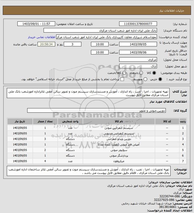 استعلام تهیه تجهیزات اجرا نصب راه اندازی آموزش و مستندسازی سیستم صوت و تصویر سالن آمفی تئاتراداره امورشعب بانک ملی استان مرکزی مطابق فایل پیوست, استعلام تهیه تجهیزات ، اجرا ، نصب ، راه اندازی ، آموزش و مستندسازی سیستم صوت و تصویر سالن آمفی تئاتراداره امورشعب بانک ملی استان مرکزی مطابق فایل پیوست