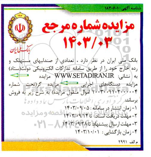 بانک ملی ایران در نظر دارد، تعدادی از صندلیهای مستهلک و رده خارج خود را از طریق سامانه تدارکات الکترونیکی دولت (ستاد) مزایده دستگاههای اجرایی - مزایده گر تحت شماره 10030001102000004 اموال منقول (مزایده به شرح زیر به فروش
