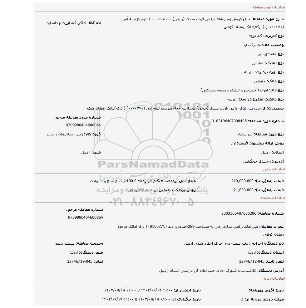 شماره مورد معامله: 3103106407000405 | شماره مورد معامله مرجع: 9709980404600864 | |