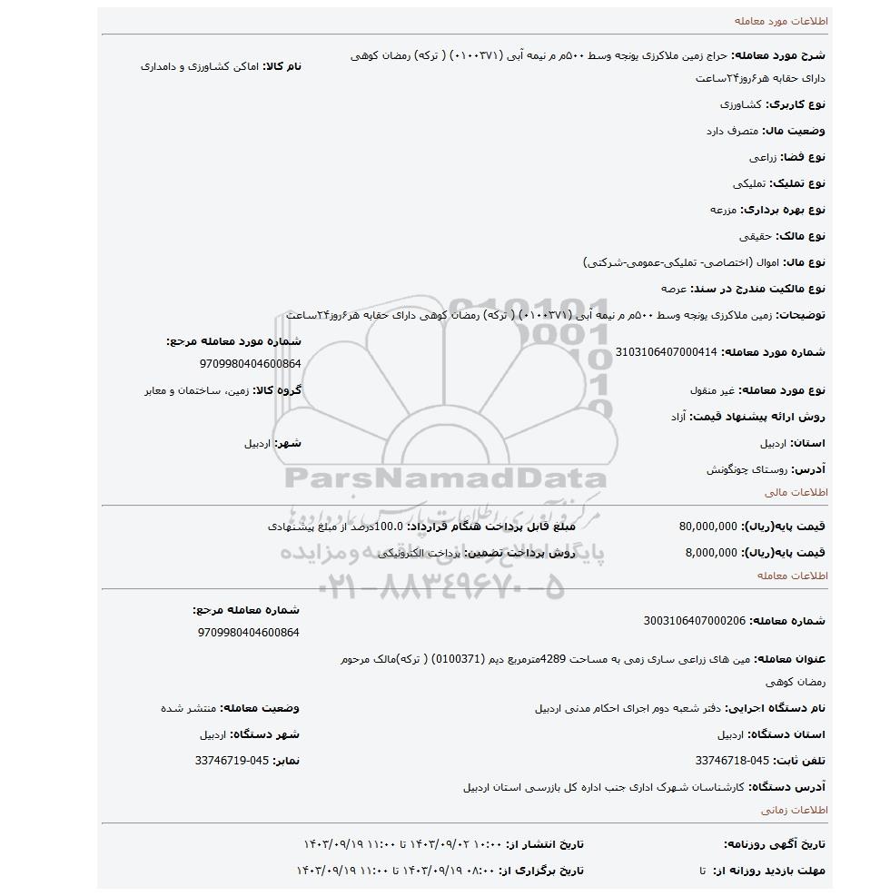 شرح مورد معامله: حراج زمین ملاکرزی یونجه وسط ۵۰۰م م نیمه آبی (۰۱۰۰۳۷۱) ( ترکه) رمضان کوهی دارای حقابه هر۶روز۲۴ساعت | نام کالا: اماکن کشاورزی و دامداری | |