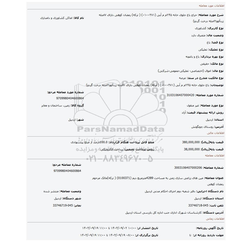 شماره مورد معامله: 3103106407000420 | شماره مورد معامله مرجع: 9709980404600864 | |