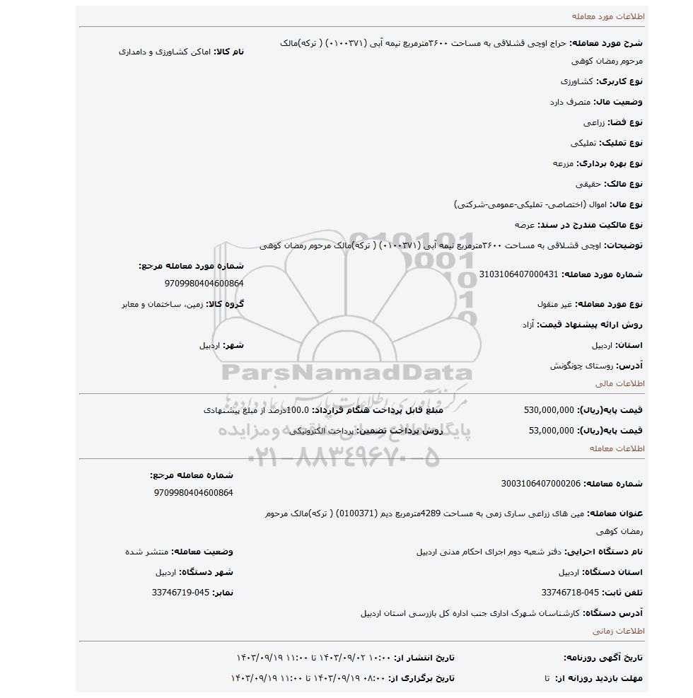 شرح مورد معامله: حراج اوچی قشلاقی به مساحت ۳۶۰۰مترمربع نیمه آبی (۰۱۰۰۳۷۱) ( ترکه)مالک مرحوم رمضان کوهی | نام کالا: اماکن کشاورزی و دامداری | |