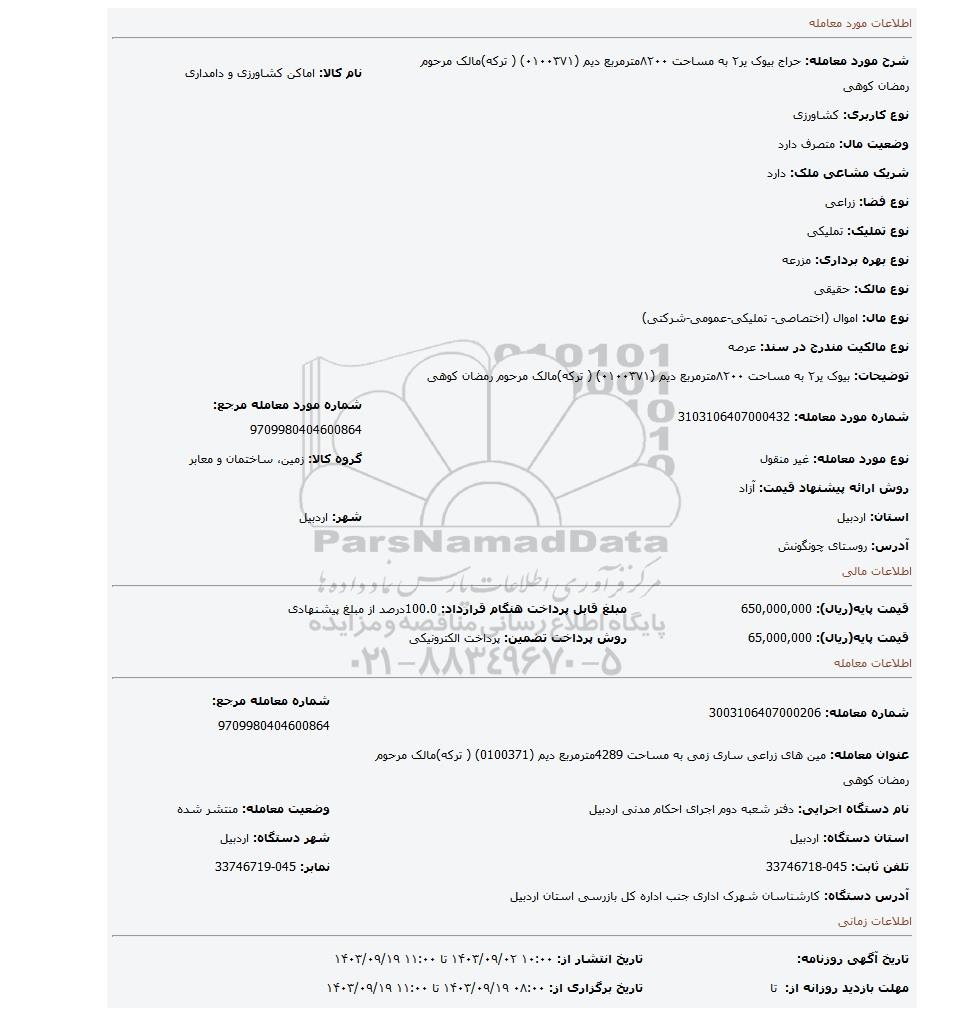 شرح مورد معامله: حراج بیوک یر۲ به مساحت ۸۲۰۰مترمربع دیم (۰۱۰۰۳۷۱) ( ترکه)مالک مرحوم رمضان کوهی | نام کالا: اماکن کشاورزی و دامداری | |