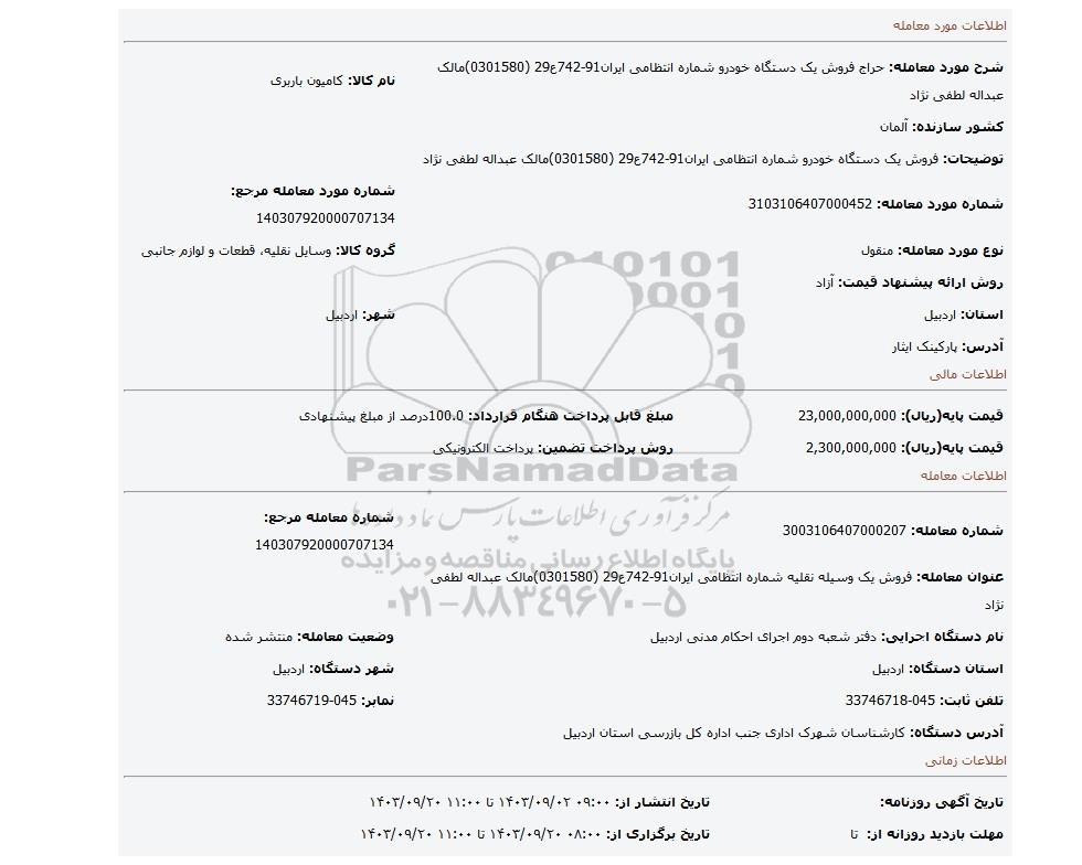 عنوان معامله: فروش یک وسیله نقلیه شماره انتظامی ایران91-742ع29 (0301580)مالک عبداله لطفی نژاد | ||