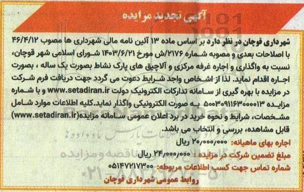شهرداری قوچان در نظر دارد بر اساس ماده 13 آئین نامه مالی شهرداری ها مصوب 46.04.12 با اصلاحات بعدی و مصوبه شماره 2176/ش مورخ 1403.6.21 شورای اسلامی شهر قوچان، نسبت به واگذاری و اجاره غرفه مرکزی و آلاچیق های پارک نشاط بصورت یک ساله، بصورت اجاره اقدام نماید. لذا از اشخاص واجد شرایط دعوت می گردد جهت دریافت فرم شرکت در مزایده با بهره گیری از سامانه تدارکات الکترونیک دولت (ستاد) و با شماره مزایده 5003091163000013 به صورت الکترونیکی واگذار نماید. کلیه اطلاعات موارد شامل مشخصات، شرایط و نحوه خرید در برد اعلان عمومی سامانه مزایده (ستاد ایران)، قابل مشاهده، بررسی و انتخاب می باشد.
