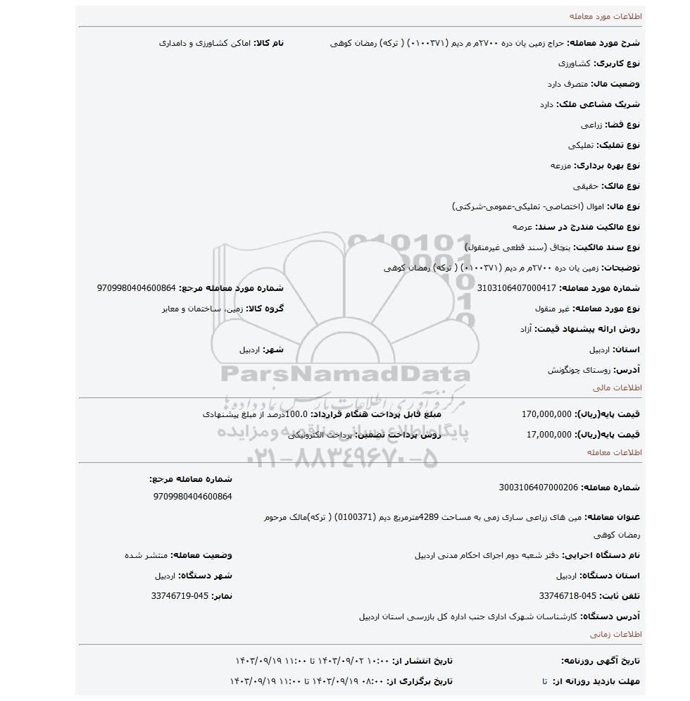 شرح مورد معامله: حراج زمین یان دره ۲۷۰۰م م دیم (۰۱۰۰۳۷۱) ( ترکه) رمضان کوهی | نام کالا: اماکن کشاورزی و دامداری | |