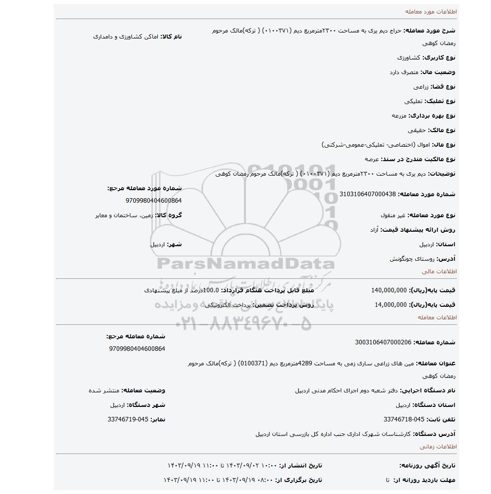 شماره مورد معامله: 3103106407000438 | شماره مورد معامله مرجع: 9709980404600864 | |