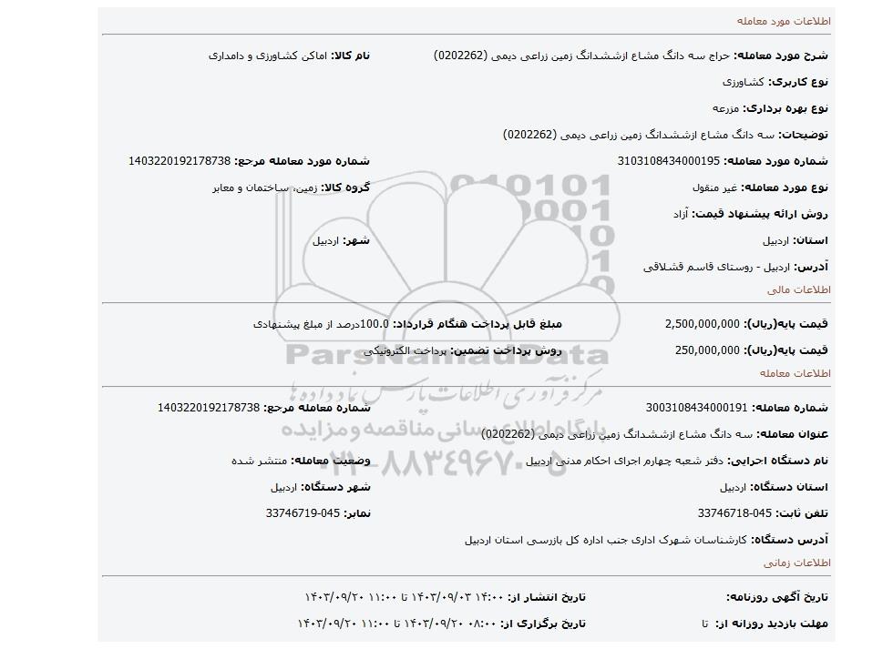 شرح مورد معامله: حراج سه دانگ مشاع ازششدانگ زمین زراعی دیمی (0202262) | نام کالا: اماکن کشاورزی و دامداری | |