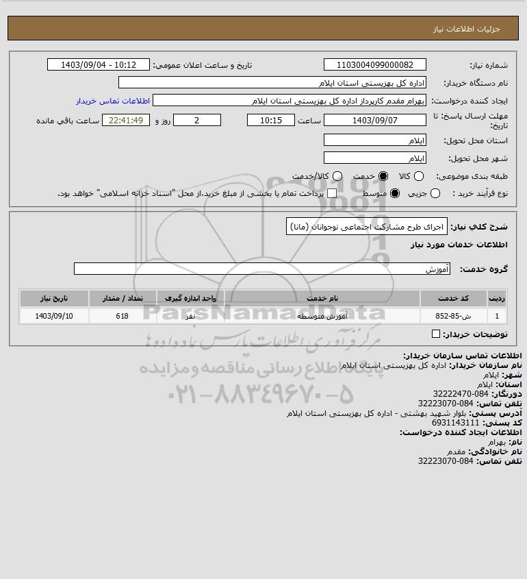 شرح کلی نیاز: اجرای طرح مشارکت اجتماعی نوجوانان (مانا)