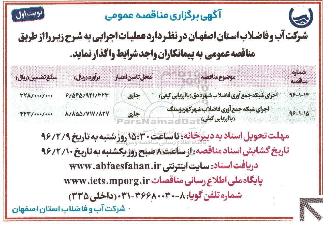 شرکت آب و فاضلاب استان اصفهان در نظر دارد عملیات اجرایی به شرح زیر را از طریق مناقصه به پیمانکاران واجدشرایط واگذار نماید.
