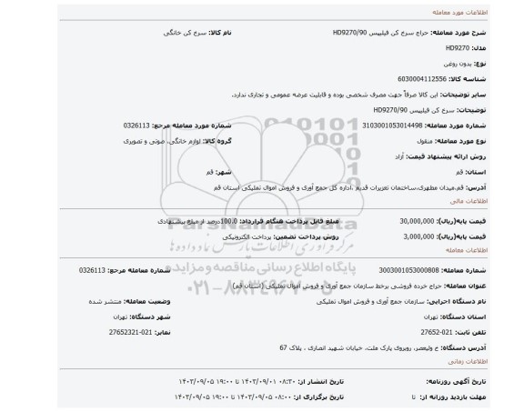 | عنوان معامله: حراج خرده فروشی برخط سازمان جمع آوری و فروش اموال تملیکی (استان قم) | ||