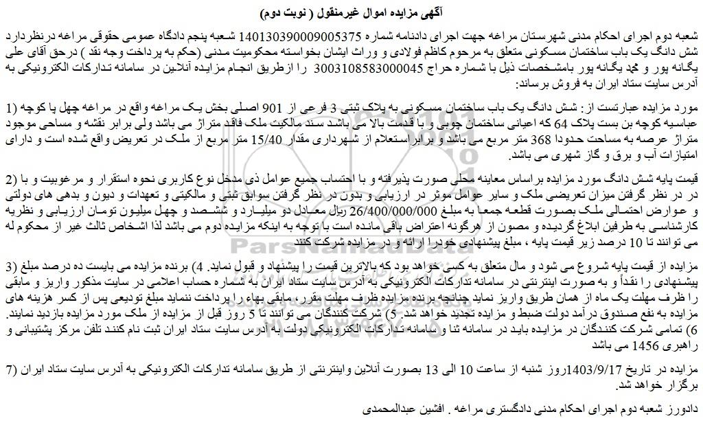 شعبه دوم اجرای احکام مدنی شهرستان مراغه جهت اجرای دادنامه شماره 140130390009005375 شعبه پنجم دادگاه عمومی حقوقی مراغه درنظردارد شش دانگ یک باب ساختمان مسکونی متعلق به مرحوم کاظم فولادی و وراث ایشان بخواسته محکومیت مدنی (حکم به پرداخت وجه نقد ) درحق آقای علی یگانه پور و محمد یگانه پور بامشخصات ذیل با شماره حراج 3003108583000045  را ازطریق انجام مزایده آنلاین در سامانه تدارکات الکترونیکی به آدرس سایت ستاد ایران به فروش برساند: