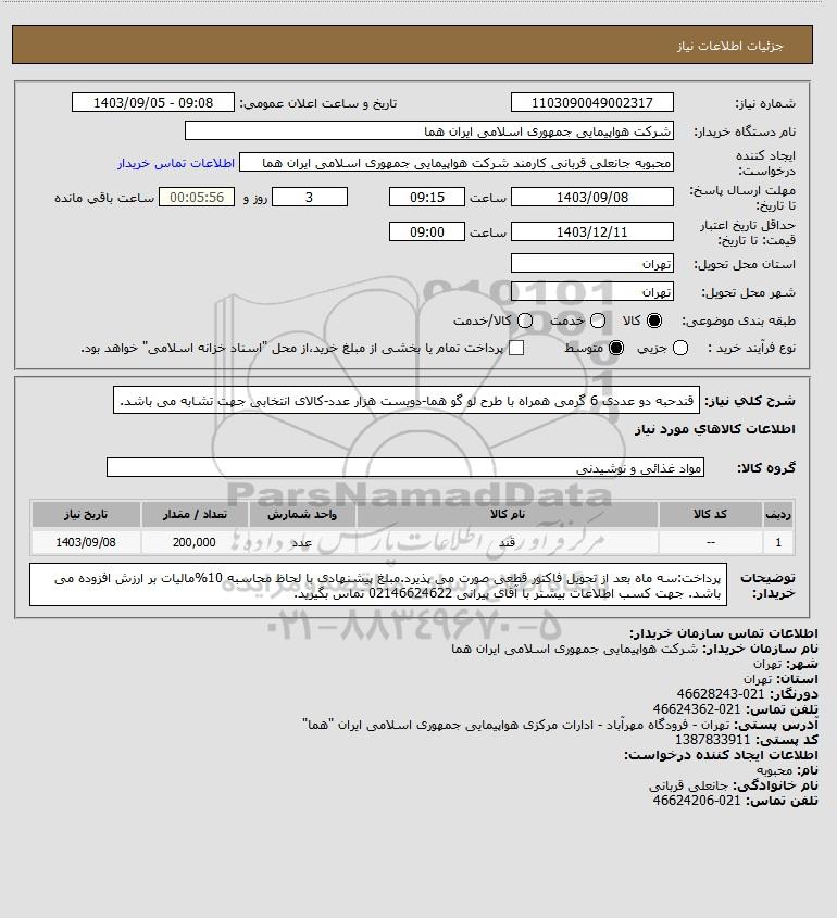 شرح کلی نیاز: قندحبه دو عددی 6 گرمی همراه با طرح لو گو هما-دویست هزار عدد-کالای انتخابی جهت تشابه می باشد.
