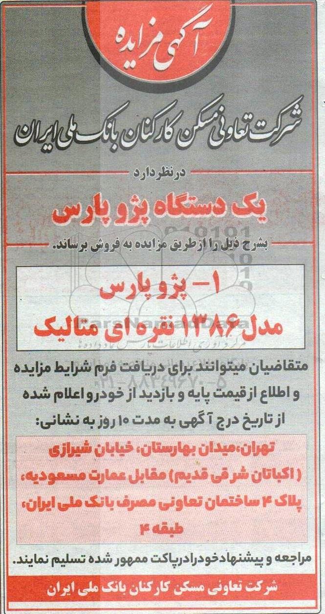 شرکت تعاونی مسکن کارکنان بانک ملی ایران در نظر دارد یک دستگاه پژو پارس بشرح ذیل را از طریق مزایده به فروش برساند.