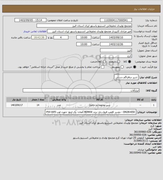 نام دستگاه خریدار:مجتمع تولیدی تحقیقاتی انستیتو پاستور ایران استان البرز