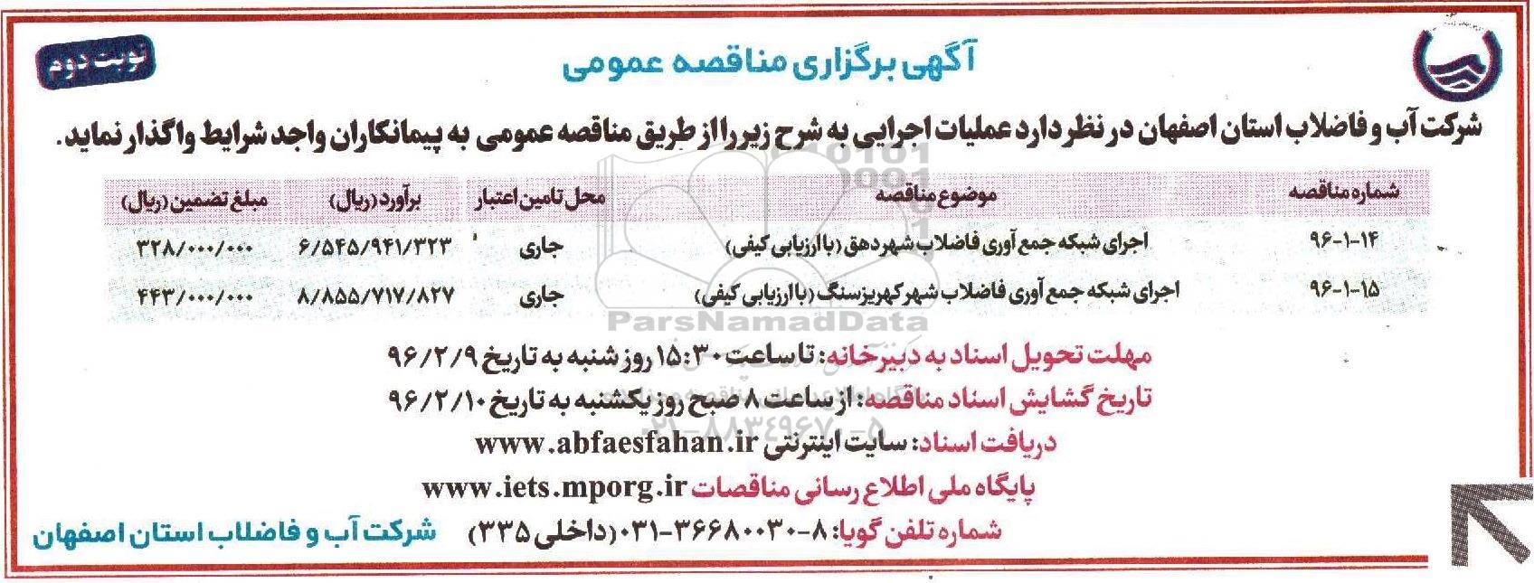 شرکت آب و فاضلاب استان اصفهان در نظر دارد عملیات اجرایی به شرح زیر را از طریق مناقصه به پیمانکاران واجدشرایط واگذار نماید.
