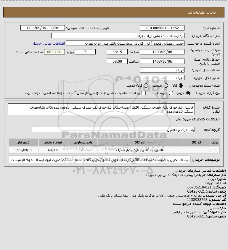 | 1 | -- | قاشق، چنگال و چاقوی یکبار مصرف | عدد | 60,000 | 1403/09/10 |