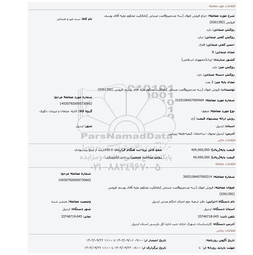 عنوان معامله: فروش اموال (سه عددمیزو8عدد صندلی )بامالکیت محکوم علیه آقای یوسف فروتنی (0301392) | ||