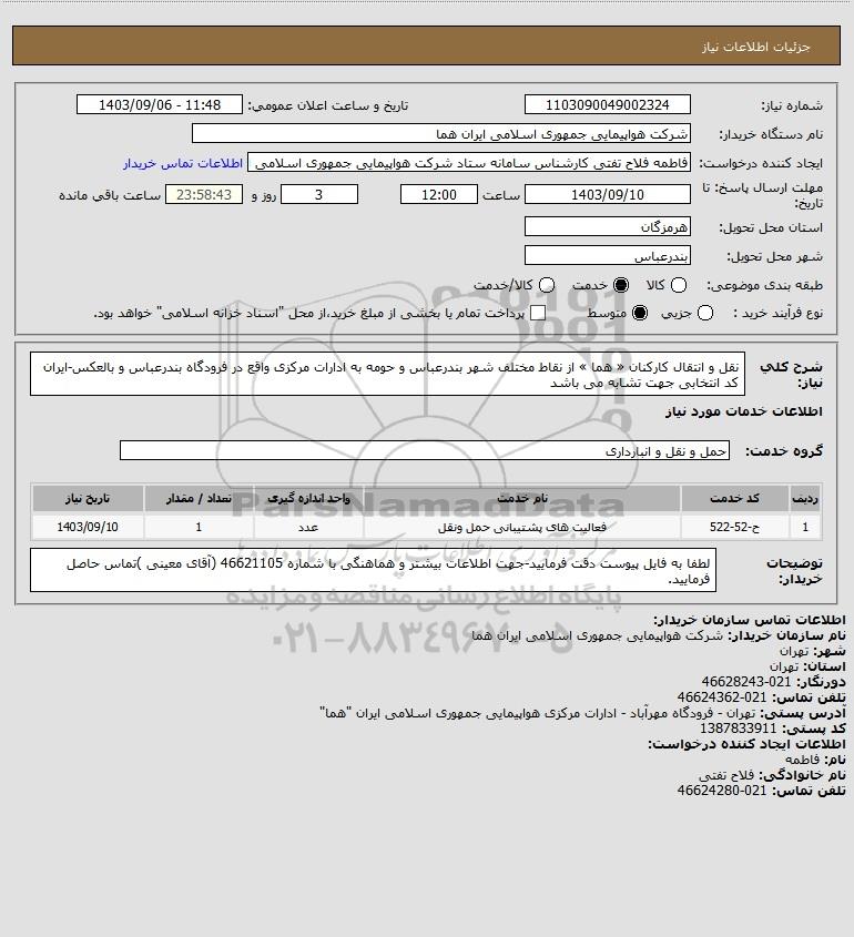 شرح کلی نیاز: نقل و انتقال کارکنان « هما » از نقاط مختلف شهر بندرعباس و حومه به ادارات مرکزی واقع در فرودگاه بندرعباس و بالعکس-ایران کد انتخابی جهت تشابه می باشد