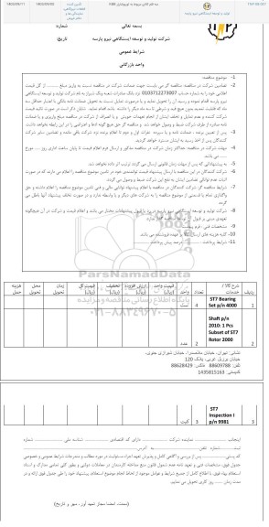 | TNP - 08 - 007 | تولید و توسعه ایستگاهی نیرو پارسه | سه قلم کالای مربوط به توربو شارژر KBB | تامین کننده قطعات نیروگاهی، نمایندگی ها و دفاتر فروش | 1403.9.5 | 1403.9.11 |