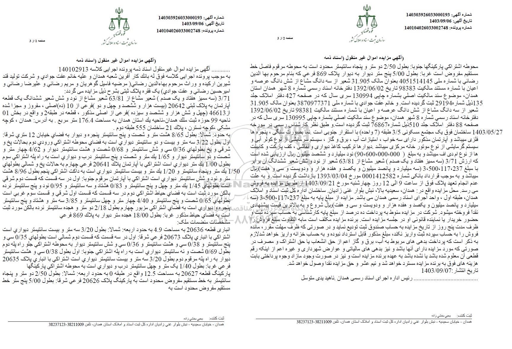 مزایده ششدانگ یک قطعه آپارتمان به پلاک ثبتی 20642 فرعی از 10 اصلی