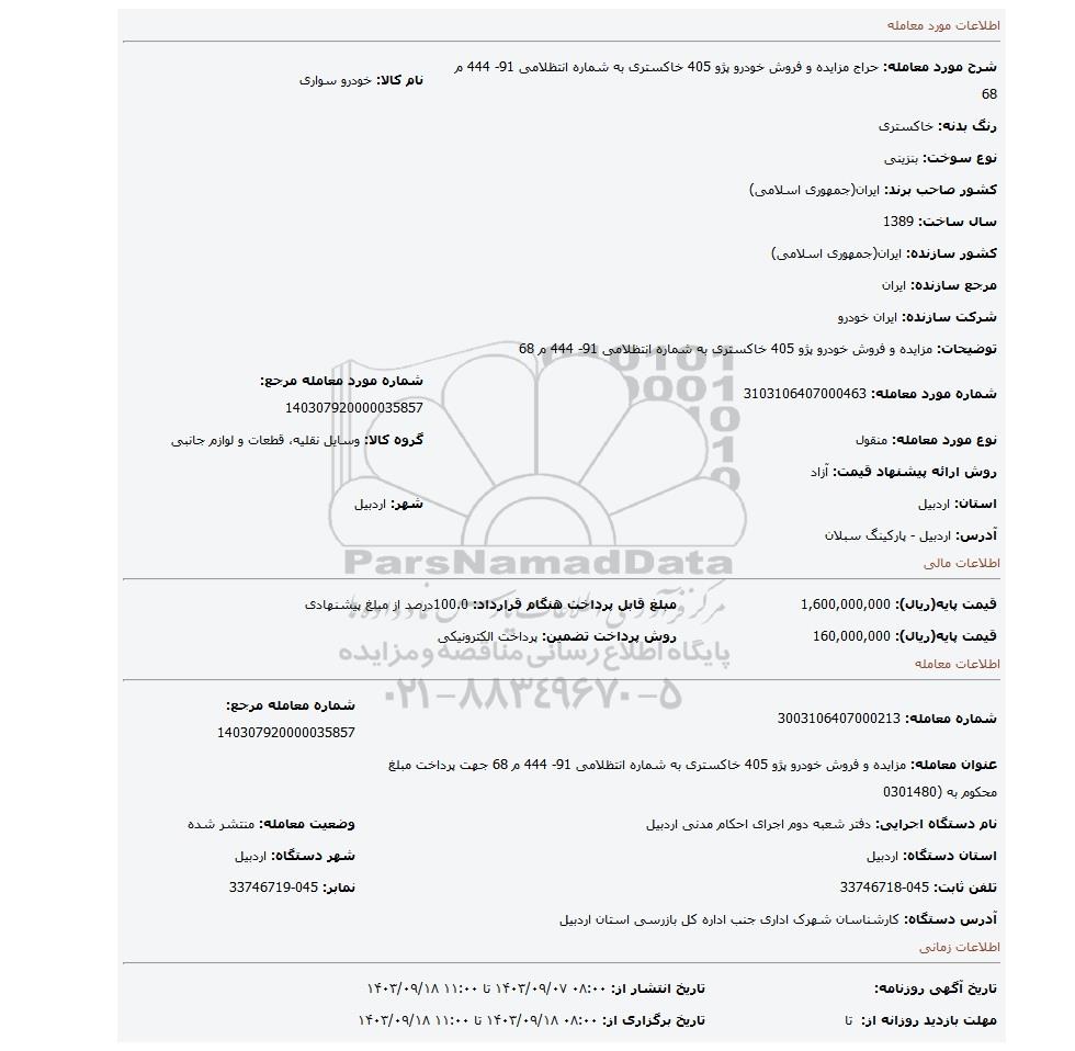 عنوان معامله: مزایده و فروش خودرو پژو 405 خاکستری به شماره انتظلامی 91- 444 م 68 جهت پرداخت مبلغ محکوم به (0301480