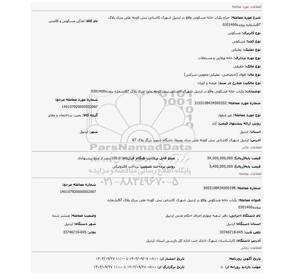 عنوان معامله: یکباب خانه مسکونی واقع در اردبیل شهرک کاشانی نبش کوچه علی بدری پلاک 67بشماره پرونده0301400
