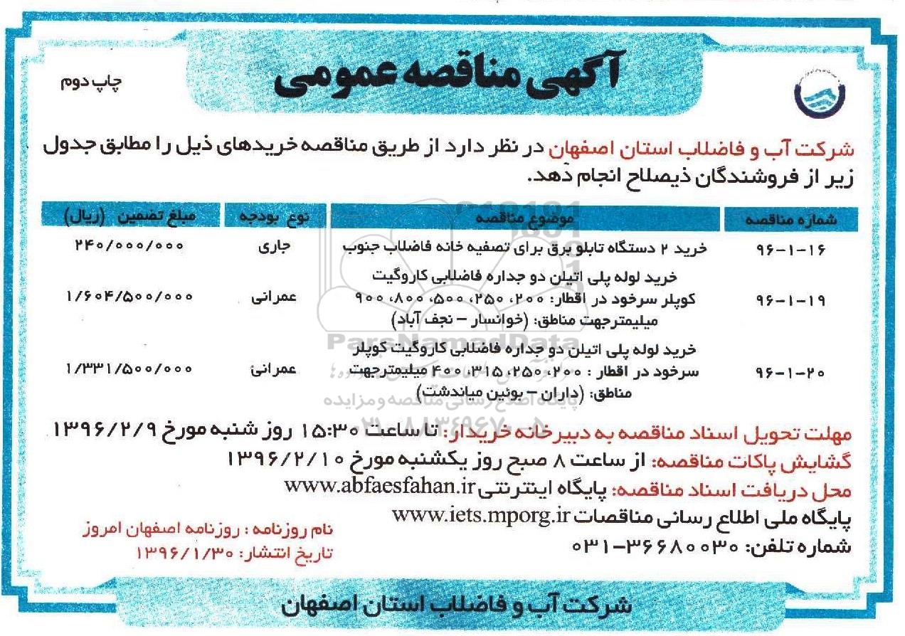 شرکت آب و فاضلاب استان اصفهان در نظر دارد را از طریق مناقصه خریدهای ذیل را مطابق جدول زیر از فروشندگان ذیصلاح انجام دهد .