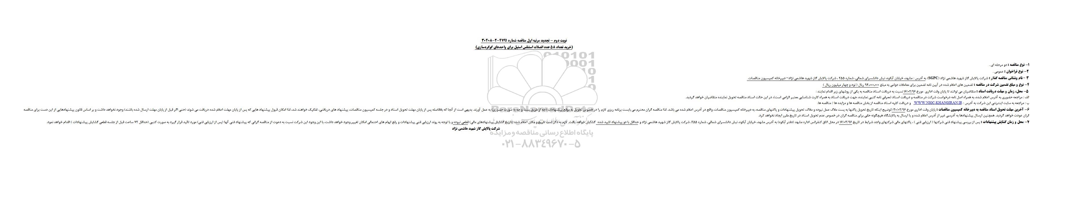 نوبت دوم- تجدید مرتبه اول مناقصه شماره 4791-2-30408 (خرید تعداد 58 عدد اتصلات استنلس استیل برای واحدهای گوگرد سازی)