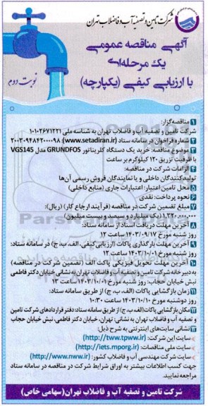 مناقصه گزار شرکت تامین و تصفیه آب و فاضلاب تهران به شناسه ملی 10102671221