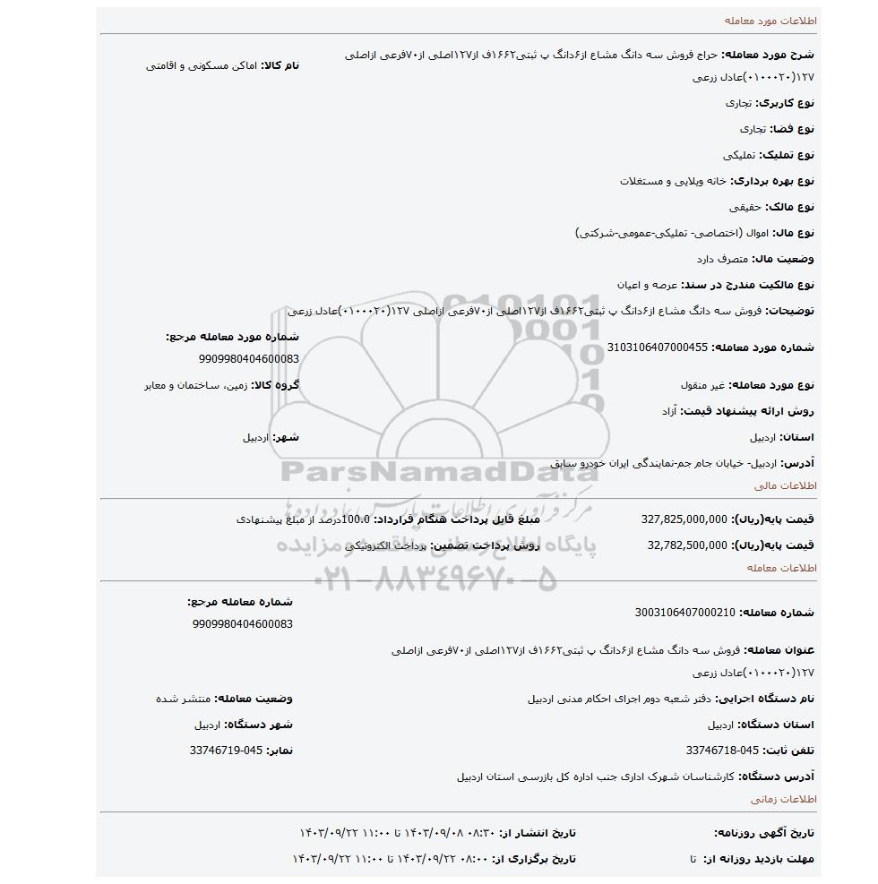 مزایده، فروش سه دانگ مشاع از۶دانگ پ ثبتی۱۶۶۲ف از۱۲۷اصلی از۷۰فرعی ازاصلی ۱۲۷(۰۱۰۰۰۲۰)عادل زرعی