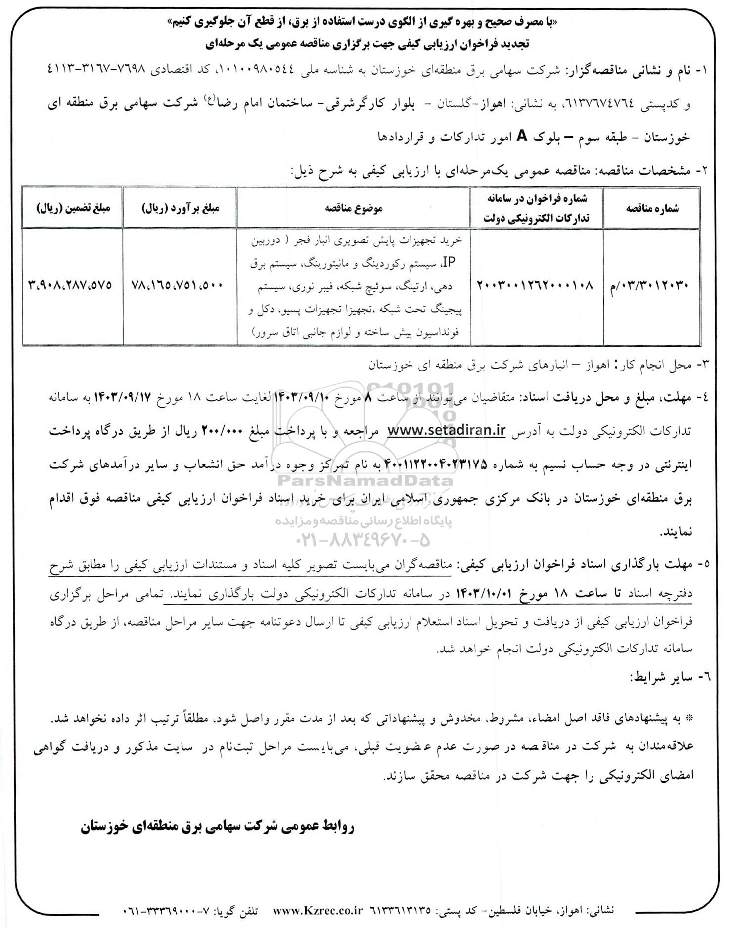 تجدید مناقصه : خرید تجهیزات پایش تصویری انبار فجر ( دوربین IP، سیستم رکوردینگ و مانیتورینگ از کلیه افراد متخصص و شرکتها واجد شرایط دعوت به عمل میآید در مناقصه با کد خبرگزاری پارس نماد: 8335150 شرکت نمایند.