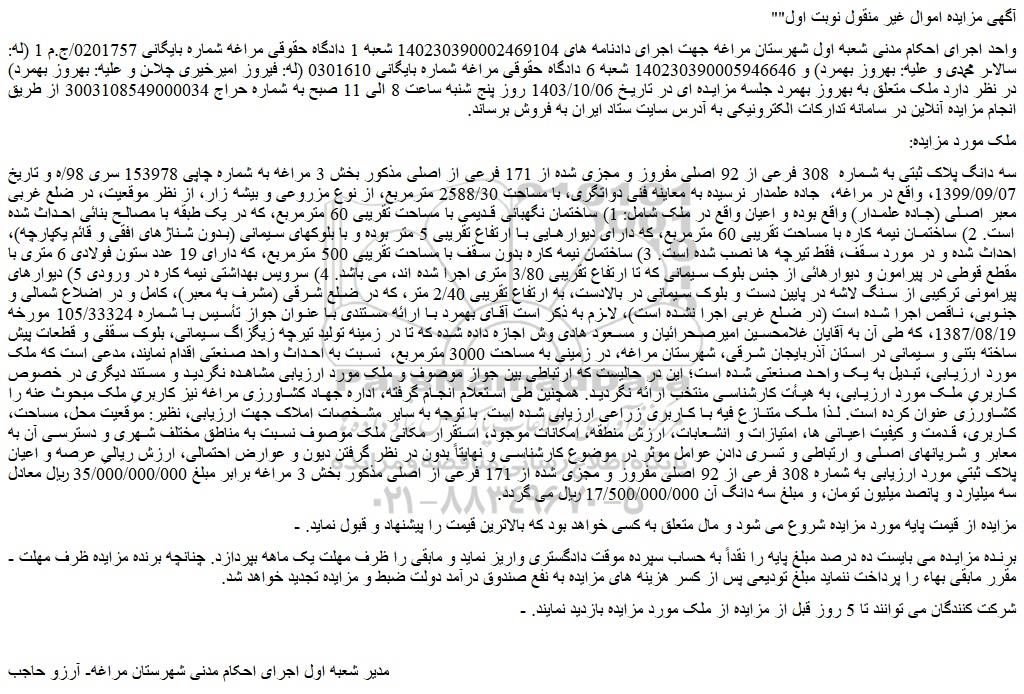 واحد اجرای احکام مدنی شعبه اول شهرستان مراغه جهت اجرای دادنامه های 140230390002469104 شعبه 1 دادگاه حقوقی مراغه شماره بایگانی 0201757/ج.م 1 (له: سالار محمدی و علیه: بهروز بهمرد) و 140230390005946646 شعبه 6 دادگاه حقوقی مراغه شماره بایگانی 0301610 (له: فیروز امیرخیری چلان و علیه: بهروز بهمرد) در نظر دارد ملک متعلق به بهروز بهمرد جلسه مزایده ای در تاریخ 1403/10/06 روز پنج شنبه ساعت 8 الی 11 صبح به شماره حراج 3003108549000034 از طریق انجام مزایده آنلاین در سامانه تدارکات الکترونیکی به آدرس سایت ستاد ایران به فروش برساند.