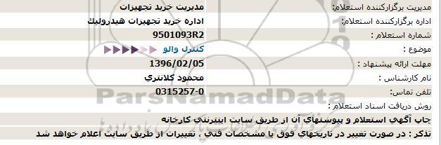 استعلام بها و موضوع استعلام استعلام كنترل والو به اطلاع کلیه شرکتها و افراد متخصص واجد شرایط میرساند، آگهی گذار در نظر دارد از طریق استعلام بها، نسبت به انتخاب و دریافت پیشنهادات اقدام نماید. این استعلام با کد آگهی ثبت شده در سامانه خبرگزاری پارس نماد : 833689 منتشر شده است. مشخصات استعلام : تاریخ شروع استعلام: 1396/01/31 آخرین مهلت ارسال پیشنهاد قیمت : 1396/02/05 و محل اجرای پروژه : استان اصفهان میباشد. استعلام قیمت مورد درخواست : استعلام كنترل والو با دستهبندیهای تخصصی و گروه های مرتبط : ابزار دقیق, شیرآلات, استعلام اطلاع رسانی میگردد.