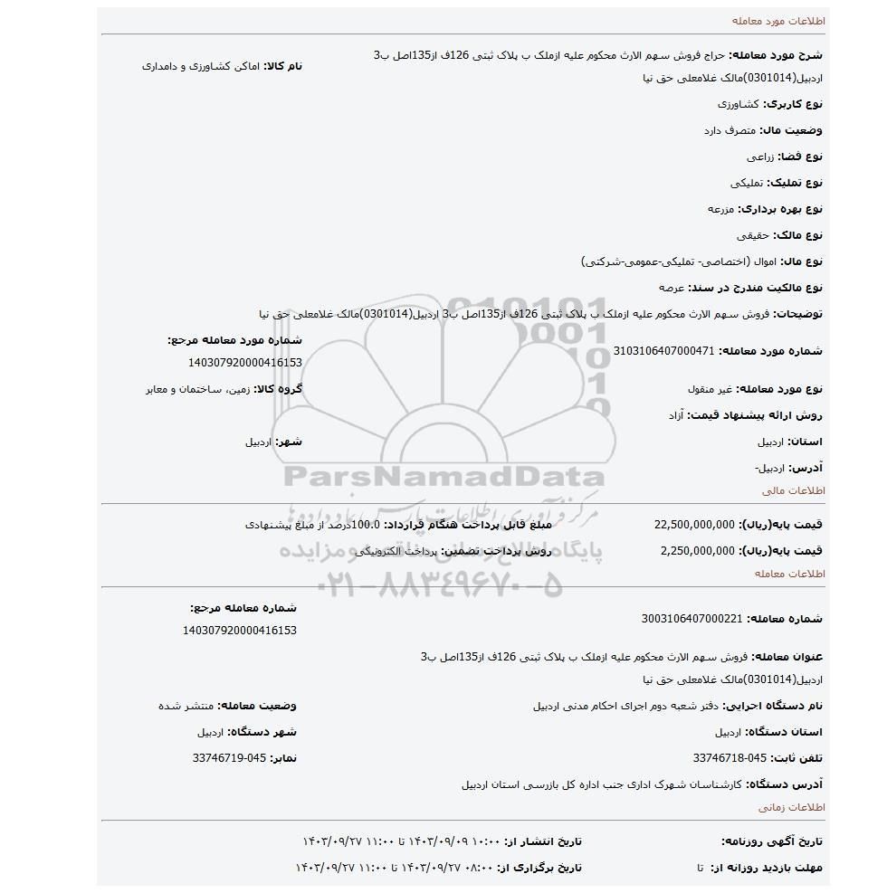 شرح مورد معامله: حراج فروش سهم الارث محکوم علیه ازملک ب پلاک ثبتی 126ف از135اصل ب3 اردبیل(0301014)مالک غلامعلی حق نیانام کالا: اماکن کشاورزی و دامداری