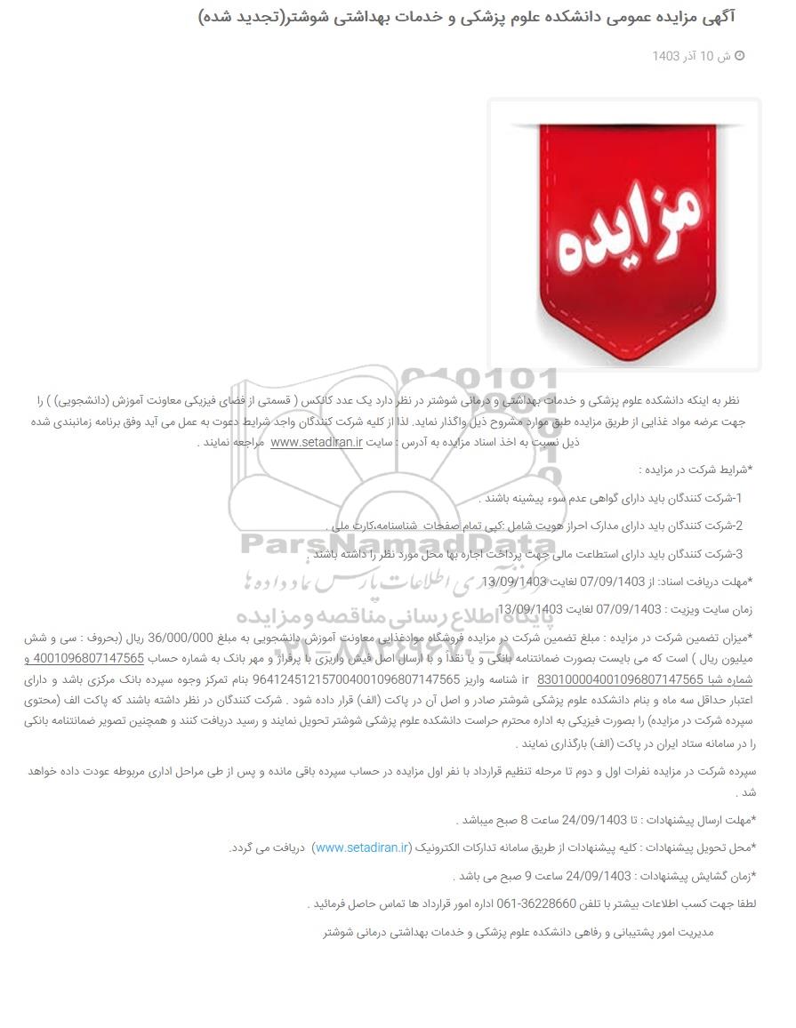 نظر به اینکه دانشکده علوم پزشکی و خدمات بهداشتی و درمانی شوشتر در نظر دارد یک عدد کانکس (قسمتی از فضای فیزیکی معاونت آموزش دانشجویی) را جهت عرضه مواد غذایی از طریق مزایده طبق موارد مشروح ذیل واگذار نماید. لذا از کلیه شرکت کنندگان واجد شرایط دعوت به عمل می آید وفق برنامه زمانبندی شده ذیل نسبت به اخذ اسناد مزایده به آدرس سایت ستاد ایران مراجعه نمایند .