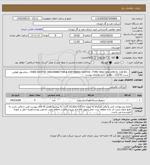 شرح کلی نیاز: , PARS SWITCH -DISCONNECTOR & EARTHINGS SWITCH -TYPE: NSA 145/1250 D, 132 KV - سکسیونر هوایی پست 132/32 - مطابق شرح تقاضای پیوست