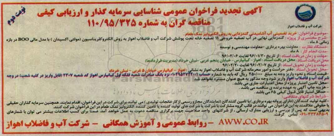 مناقصه خرید تضمینی آب آشامیدنی گندزدایی به روش الکترولیز نمک طعام نوبت دوم از کلیه افراد متخصص و شرکتها واجد شرایط دعوت به عمل میآید در مناقصه با کد خبرگزاری پارس نماد: 834220 شرکت نمایند.