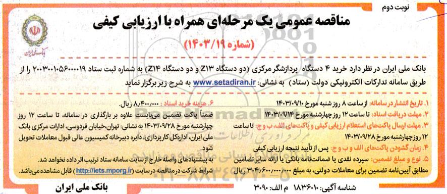 بانک ملی ایران در نظر دارد خرید 4 دستگاه پردازشگر مرکزی (دو دستگاه z13 و دو دستگاه Z14) به شماره ثبت 2003001056000019 را از طریق سامانه تدارکات الکترونیکی دولت ستاد به نشانی ستاد ایران به شرح زیر برگزار نماید: