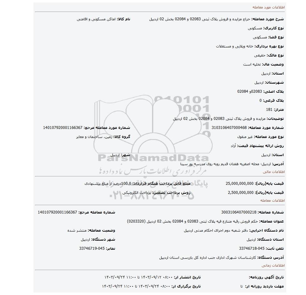 شرح مورد معامله: حراج مزایده و فروش پلاک ثبتی 02083 و 02084 بخش 02 اردبیل | نام کالا: اماکن مسکونی و اقامتی | |
