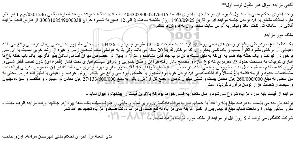 مزایده فروش یک قطعه باغ سردرختی, مزایده فروش یک قطعه باغ سردرختی