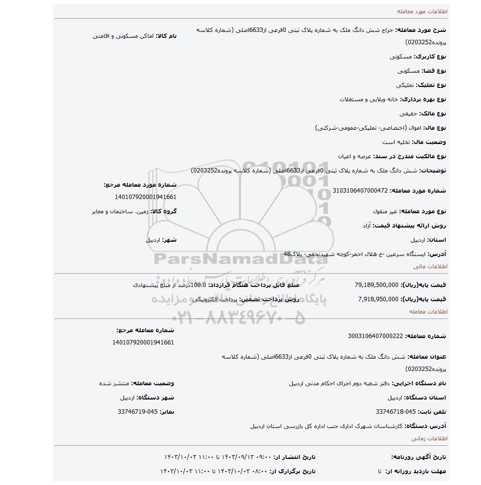 شرح مورد معامله: حراج شش دانگ ملک به شماره پلاک ثبتی 0فرعی از6633اصلی (شماره کلاسه پرونده0203252) | نام کالا: اماکن مسکونی و اقامتی | |
